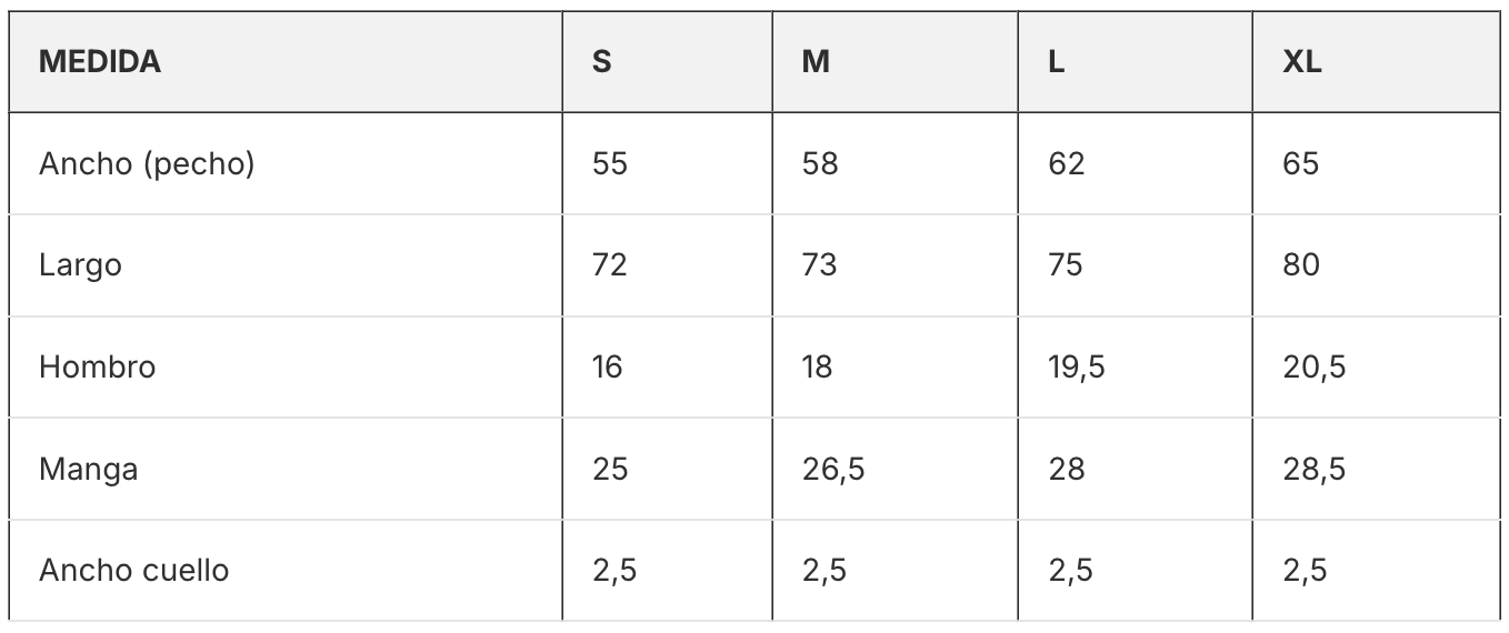 Revisa las medidas para elegir el fit que mejor se adapte a tu cuerpo y estilo.